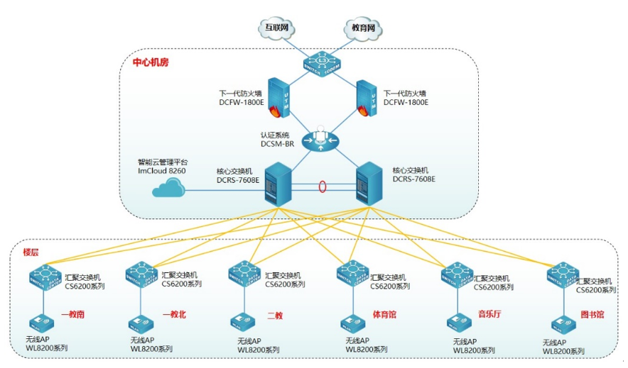 为方便用户对无线管理和维护,提升用户无线体验,使无线更智能化,此次采用艾弗森贝博ballbet官网智能云管理平台ImCloud 8260实现无线统一的管理、维护、认证,并可实现对全网无线设备管理、实现易部署、易维护、易扩展的无线网络。艾弗森贝博ballbet官网云管理ImCloud方案是网络服务的新模式,基于云端实现网络服务和管理,将复杂的网络管理简单化、智能化、可视化,提升用户网络体验。同时为了保证无线的安全,无线采用Portal准入认证,云管理ImCloud艾弗森贝博ballbet官网身份认证系统DCSM-BR实现联动,用户需要顺利获得账号和密码认证成功后才能接入无线网络,在保证无线连接的便捷性同时兼顾无线的安全性。